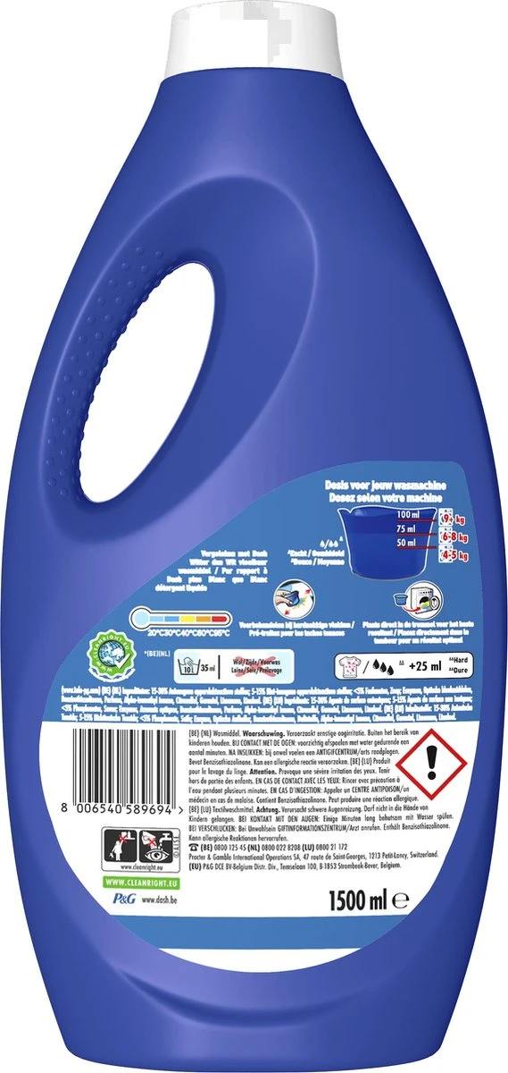 Dash vloeibaar wasmiddel Platinum, met extra reinigingskracht voor het verwijderen van zelfs hardnekkige vlekken, doeltreffend bij een lagere temperatuur, met een 100% recyclebare verpakking