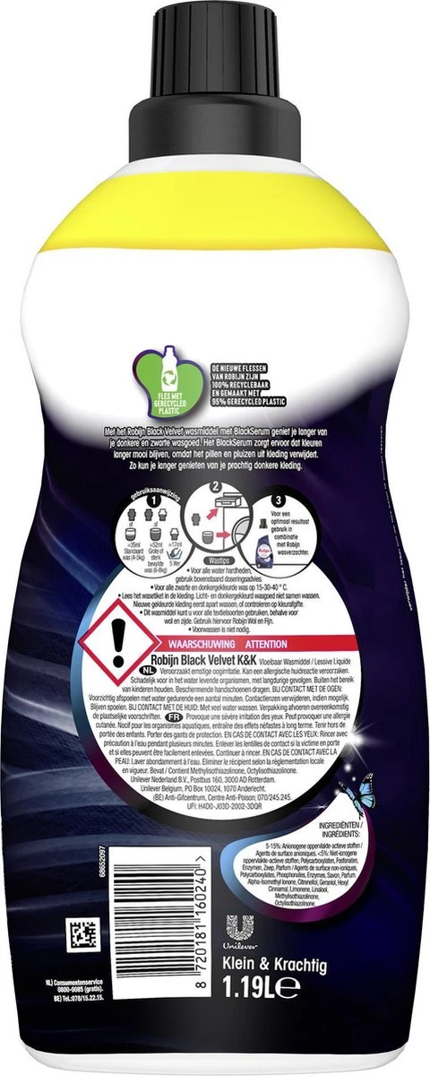 De verbeterde Robijn Black Velvet formule bevat 80% biologisch afbreekbare ingrediënten. We zijn op weg naar volledig biologisch afbreekbare formules. De vertrouwde effectiviteit en bekende geuren van Robijn, gecombineerd met de kracht van de natuur. Goed voor je kleding en beter voor de planeet. Bovendien zijn de flessen gemaakt van 95% gerecycled plastic en zijn ze 100% recyclebaar. Op deze manier draagt Robijn bij aan een duurzamere manier van wassen.